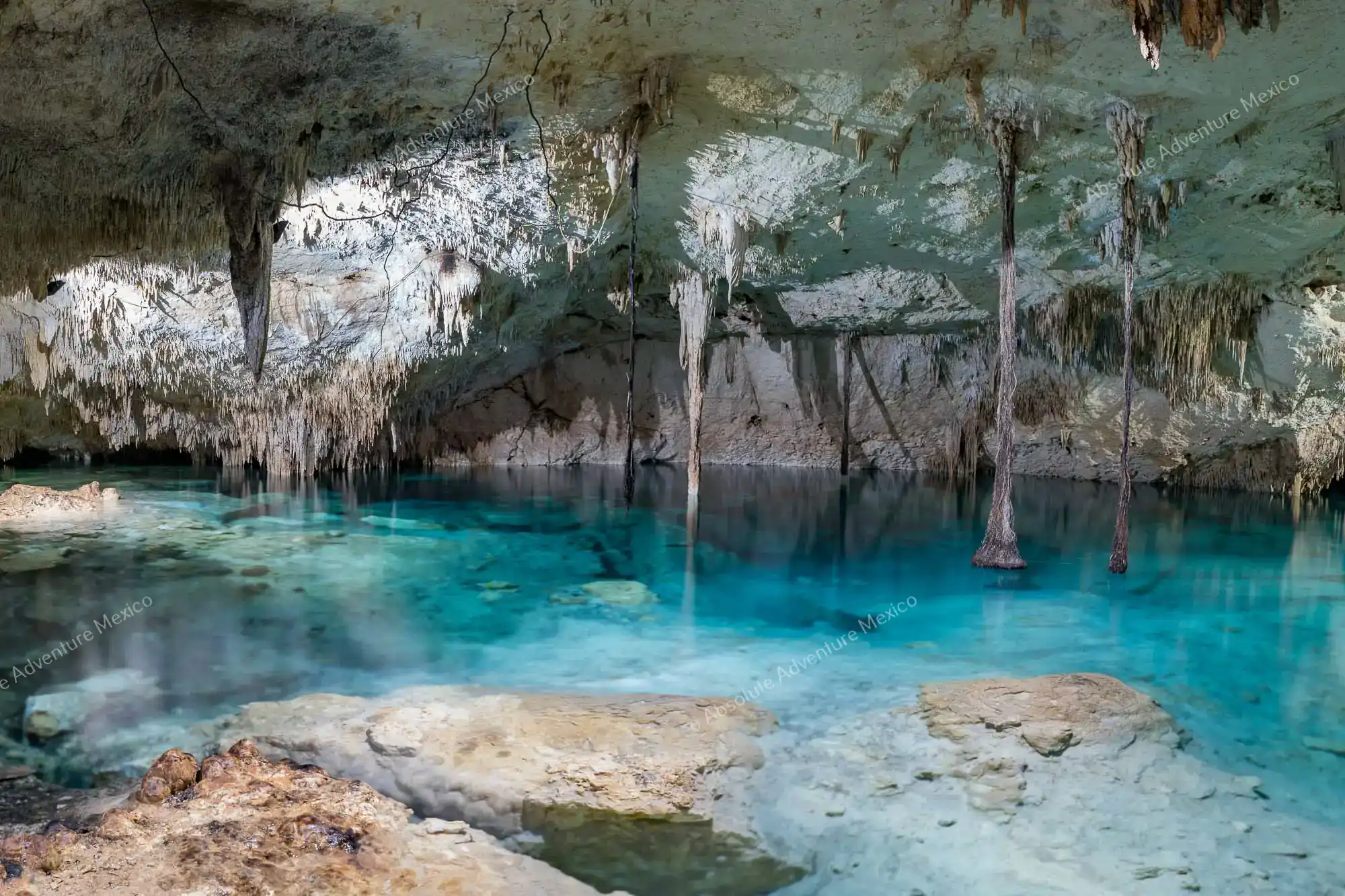 Cenote Taak bi Ha: a small natural cave cenote nestled in the heart of the Mayan jungle, Swim and snorkel to marvel at stunning stalactites and stalagmites.