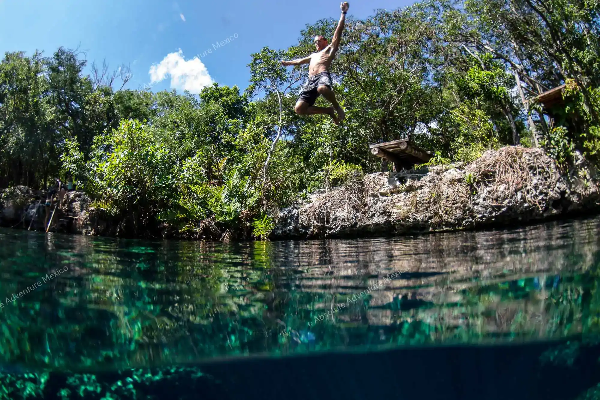 Cenote Jaguar: Embark on an exhilarating adventure! Cliff jumping and zip line await you. A captivating open-air cenote surrounded by lush vegetation, where you can also easily access and swim.